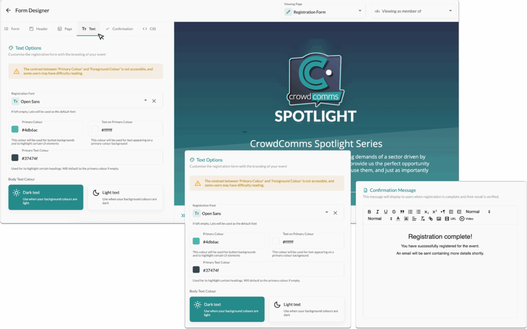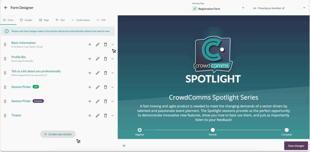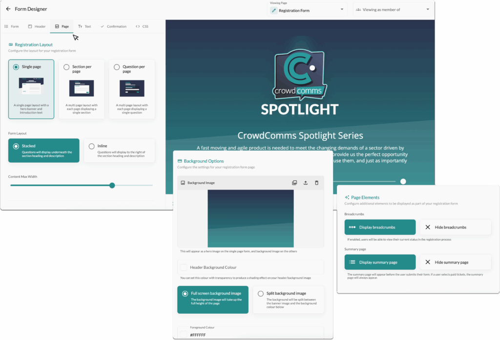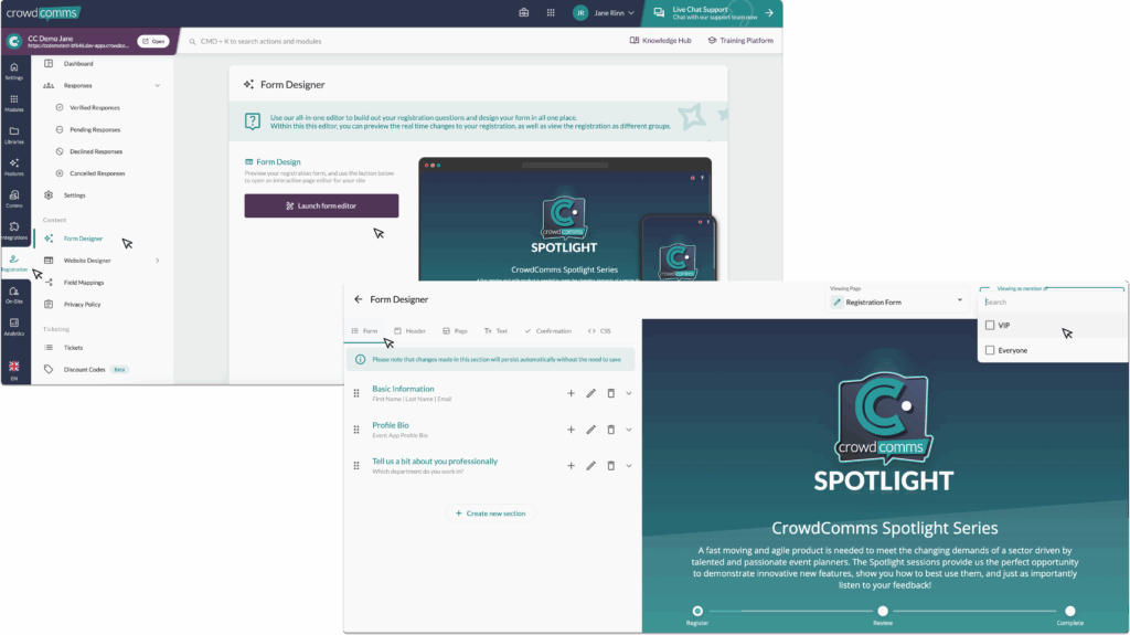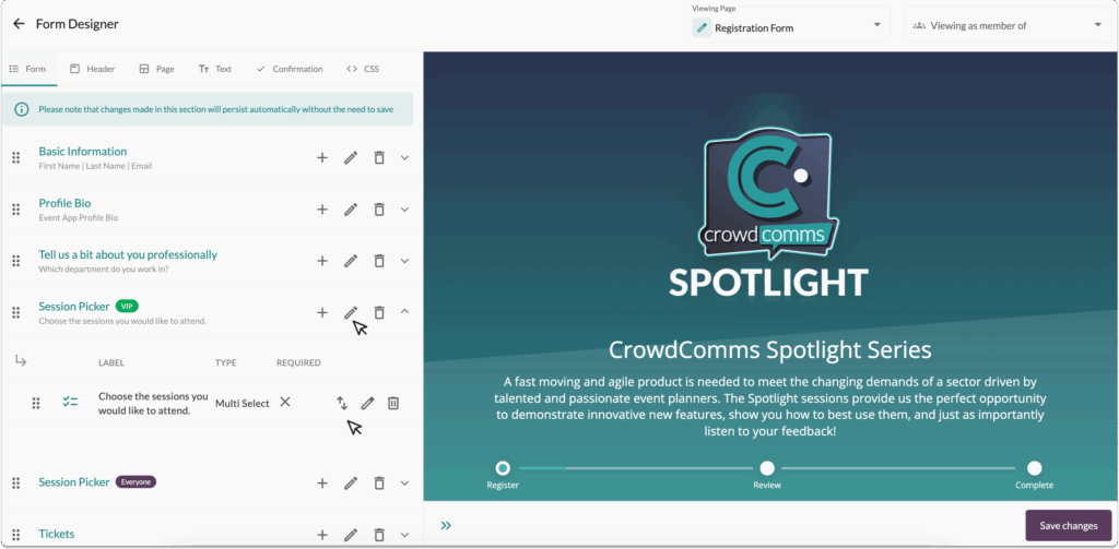 Once inside the Form Designer select the ‘Launch form editor’ button and you’ll find a sleek preview of your registration form. Need to tweak the layout or preview it for different groups? No problem. Utilise the dropdown menus at the top right to tailor your view precisely to your needs. From this drop down you can select each page for various stages of the registration journey and edit them accordingly.