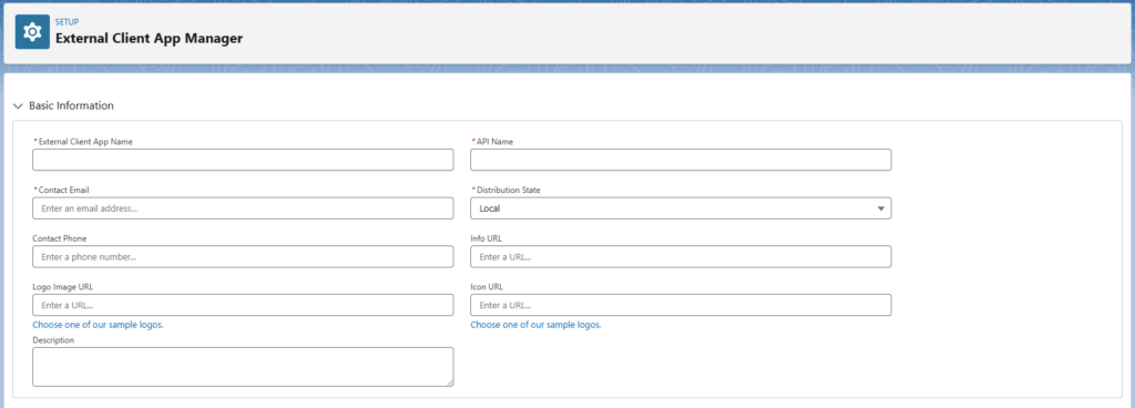 On the right side of the window, select the New Connected App button, and in the dialog window select Create a Connected App, then select continue.