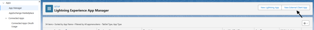 2. On the next page, navigate to the left sidebar menu and select Apps, then within the sub menu select App Manager. This will open a list of existing Apps for your Salesforce Account.