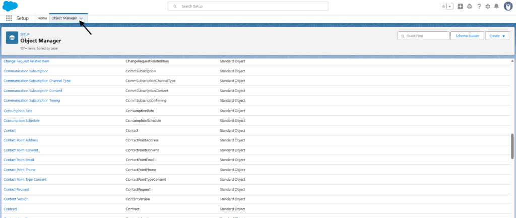 12. To get the Contact Object Name for the CMS (this will be the table where you wish to extract the data from in Salesforce to go to the CMS) open the Object Manager tab, and scroll to find the label you require. Copy the API Name field and save to the notepad.