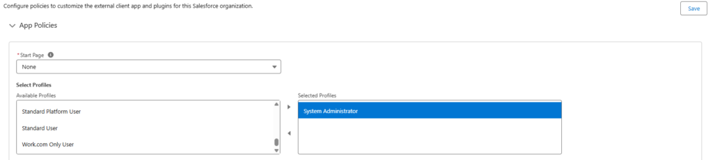 11. Next scroll to the Profiles section, and select the Manage Profiles button. On the next screen, select the roles that are assigned to the ‘Run As User’ you chose in the previous step. These roles will be mirrored here. In this guide, the ‘Run As User’ I selected has the System Administrator role on their profile, so I’ve chosen ‘System Administrator’ from the list. Then click save.