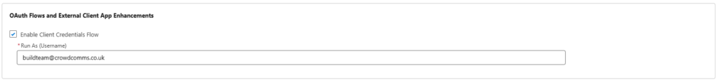 10. Scroll down to the Client Credentials Flow section, and select the search icon next to the Run As input field. In the dialogue, select the appropriate user. When the integration runs it will run as this user, so this user will need to have the appropriate access levels applied. Then click Save.