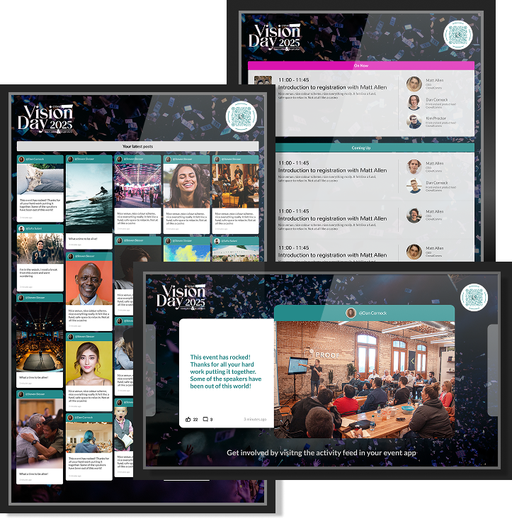 The display screen feature provides a visually engaging way to present key content to a live audience. It includes dedicated screens for the Activity Feed, Agenda, Gaming, and Sponsors, each screen designed to deliver clear, accessible information in a visually enjoyable way that is fully customisable.