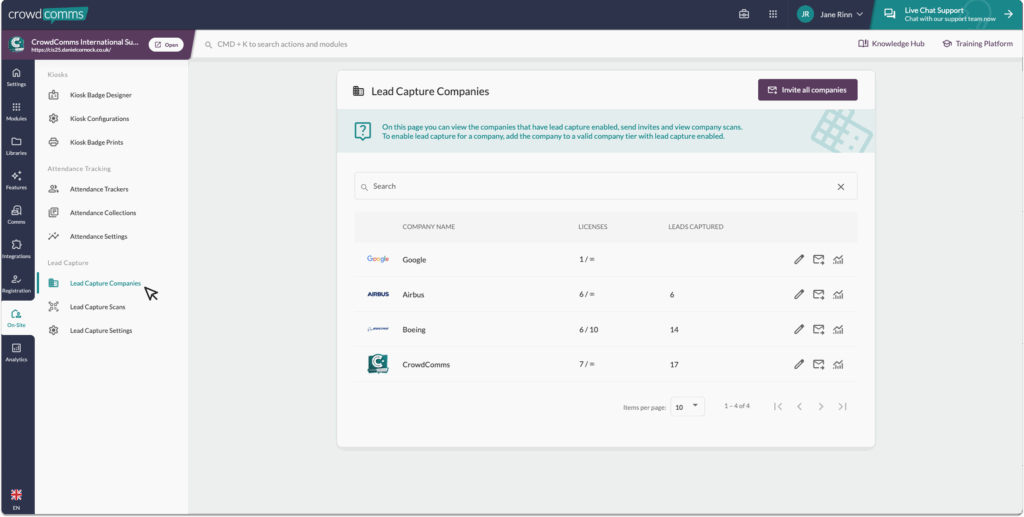 - Invite reps to the lead capture application either by clicking the envelope on the table line item or invite all companies in one go by clicking the Invite all companies button in the top right.