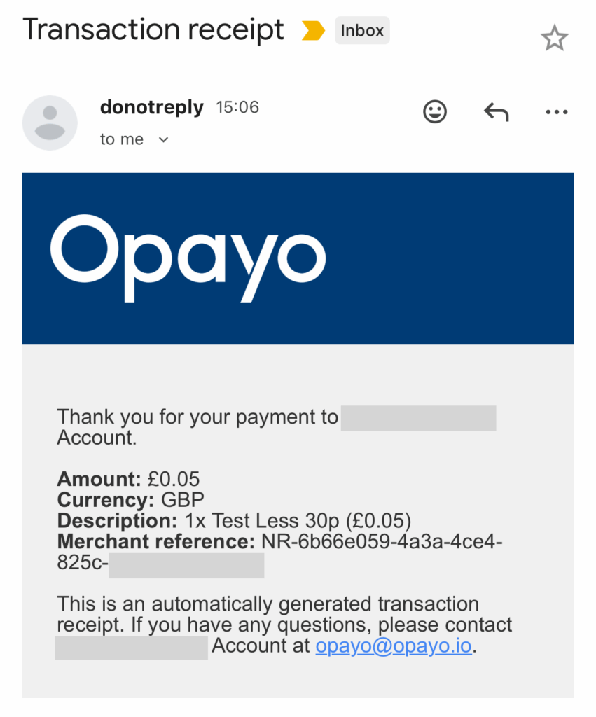 Opayo is automatically configured to send users a transaction receipt, an example of which is below. Visit Opayo support for help customising receipts.