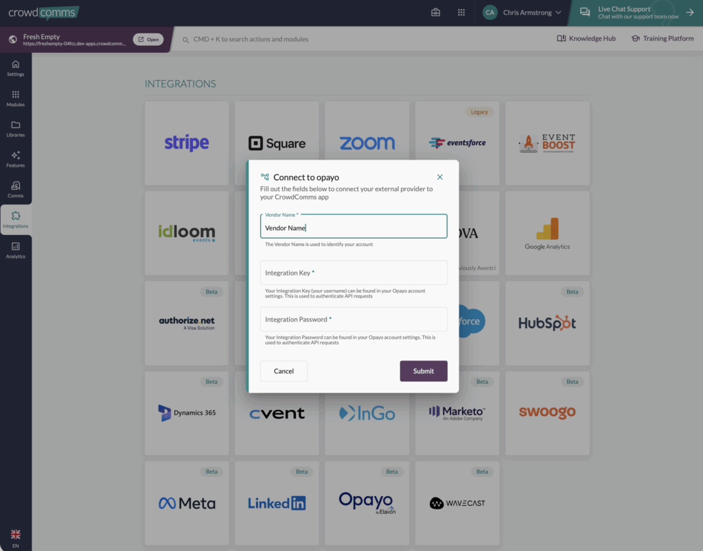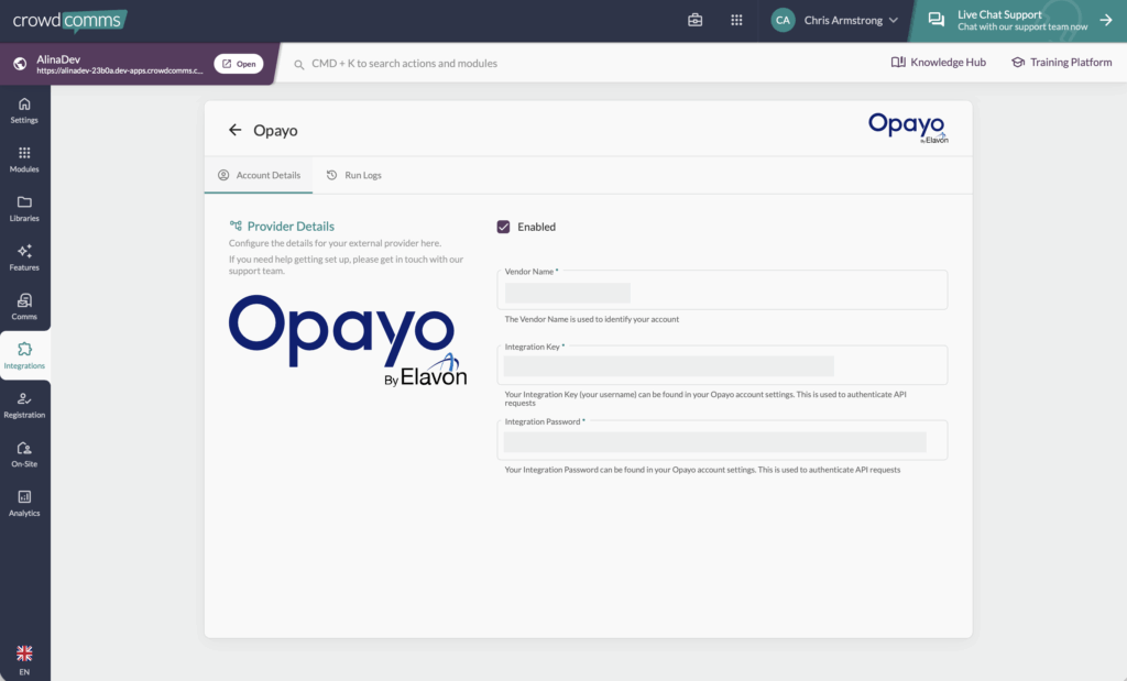 Once you have these pieces of information, open the CrowdComms Dashboard, navigate to the event you wish to setup the integration within, select Integrations from the left hand menu and choose Opayo.