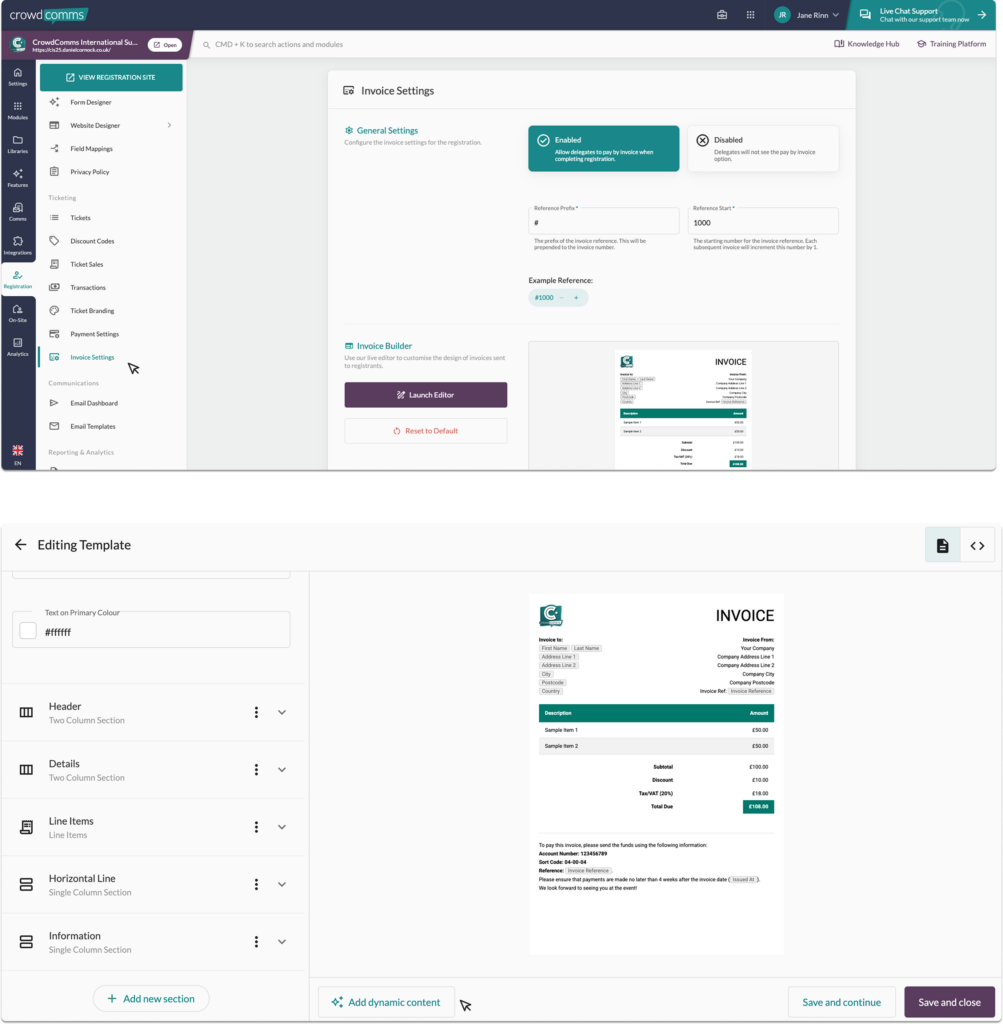 Once enabled, log into the CMS and navigate to the Registration tab on the left side menu, within the secondary menu select Invoice Settings. From here you can: